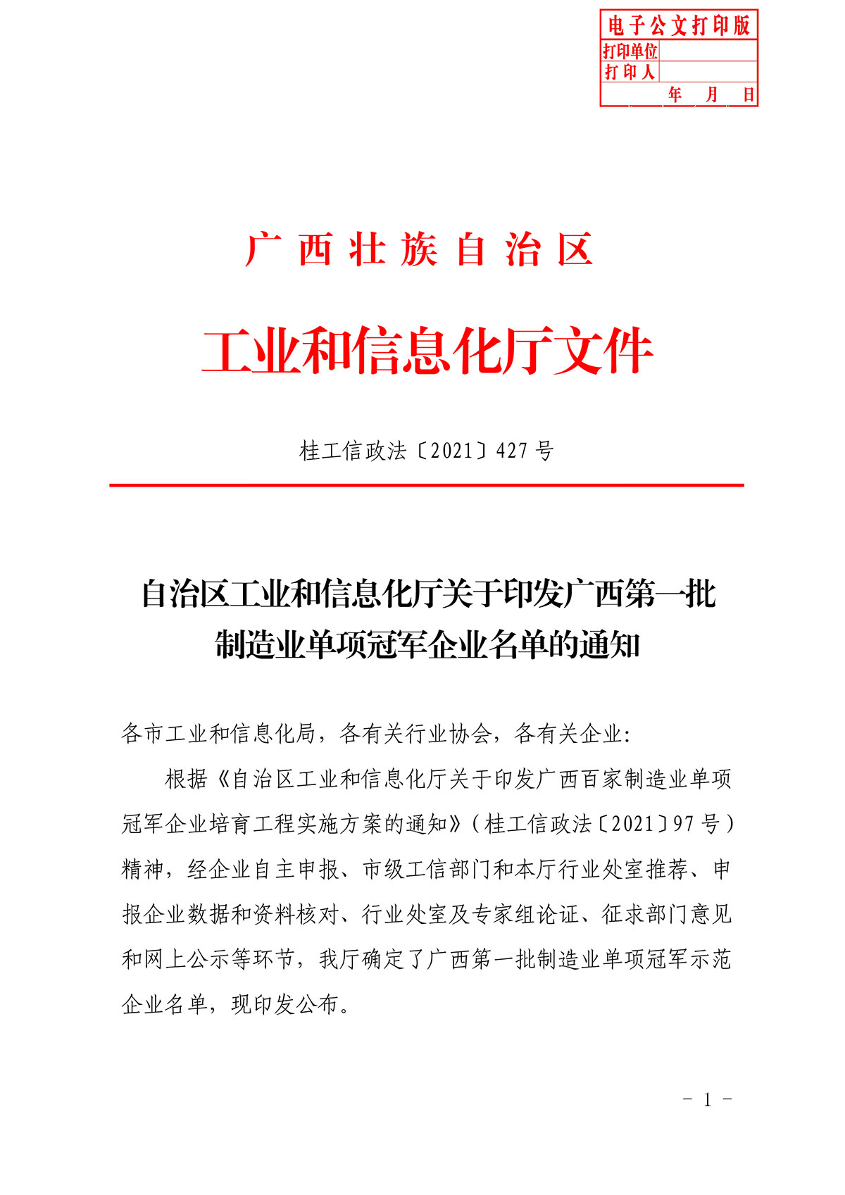 據悉,“廣西第一批制造業單項冠軍示范企業”的培育,旨在引導企業樹立“十年磨一劍”的精神,鼓勵企業長期專注擅長的領域,走“專特優精”發展道路,引導制造業企業長期專注于細分產品市場的創新、產品質量提升和品牌培育,帶動和培育一批企業成長為單項冠軍示范企業,鞏固和提升其區內外地位,促進單項冠軍示范企業進一步做優做強,提高發展效益和質量,提升我區制造業核心競爭力,促進制造業提質增效升級。