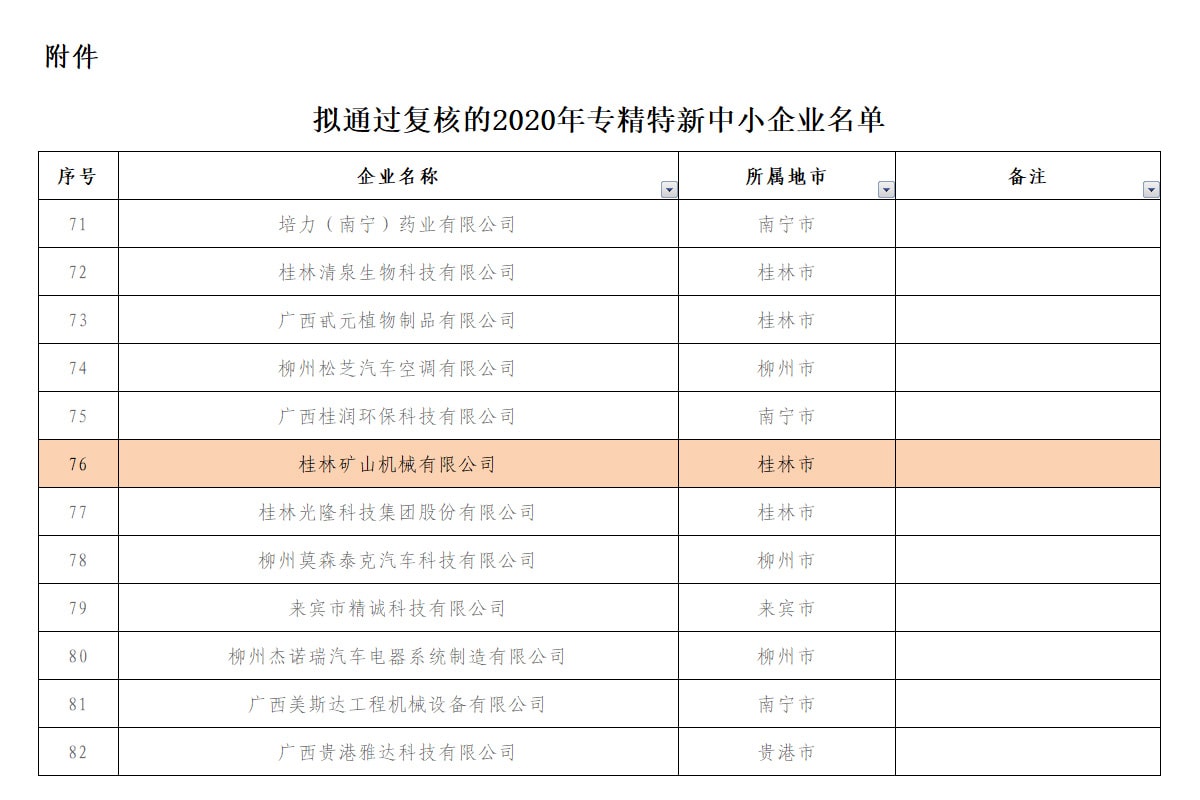 近日,自治區工信廳公布了2020年專精特新中小企業復核結果,桂林礦機憑借卓越的技術創新能力和突出的市場表現,被列入復核通過名單。